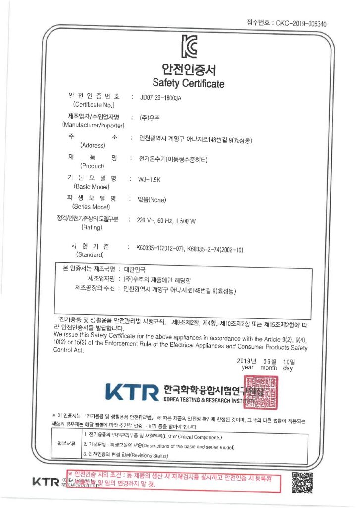 1.5K 온수히터 안전인증