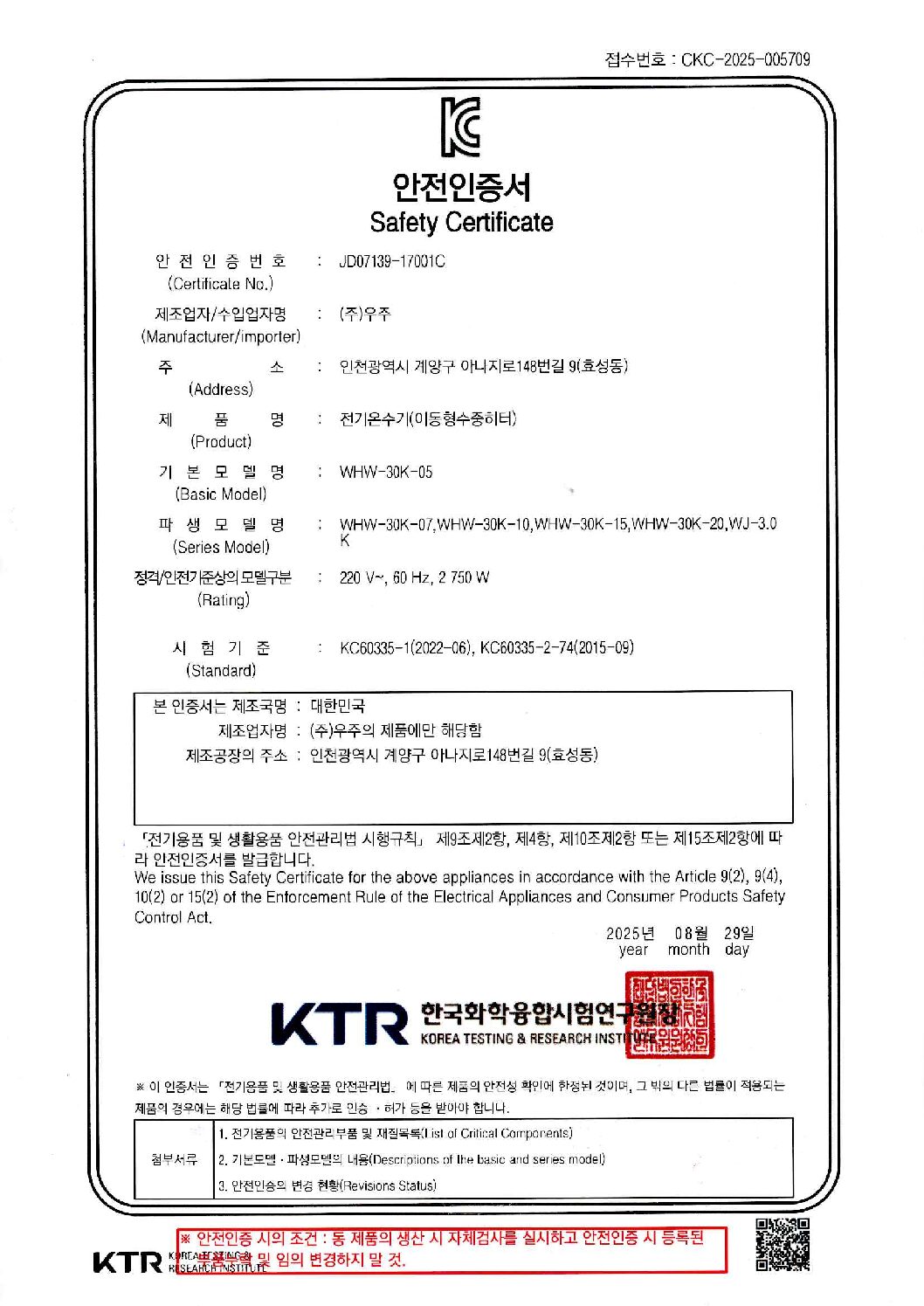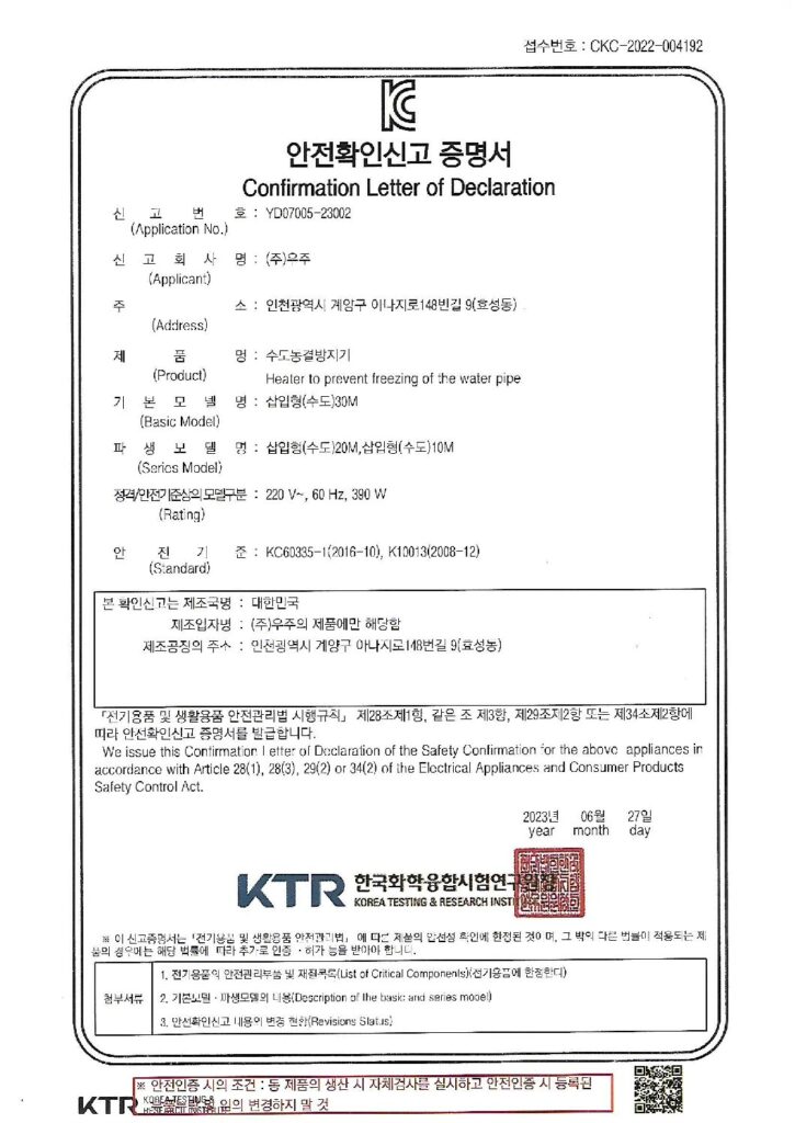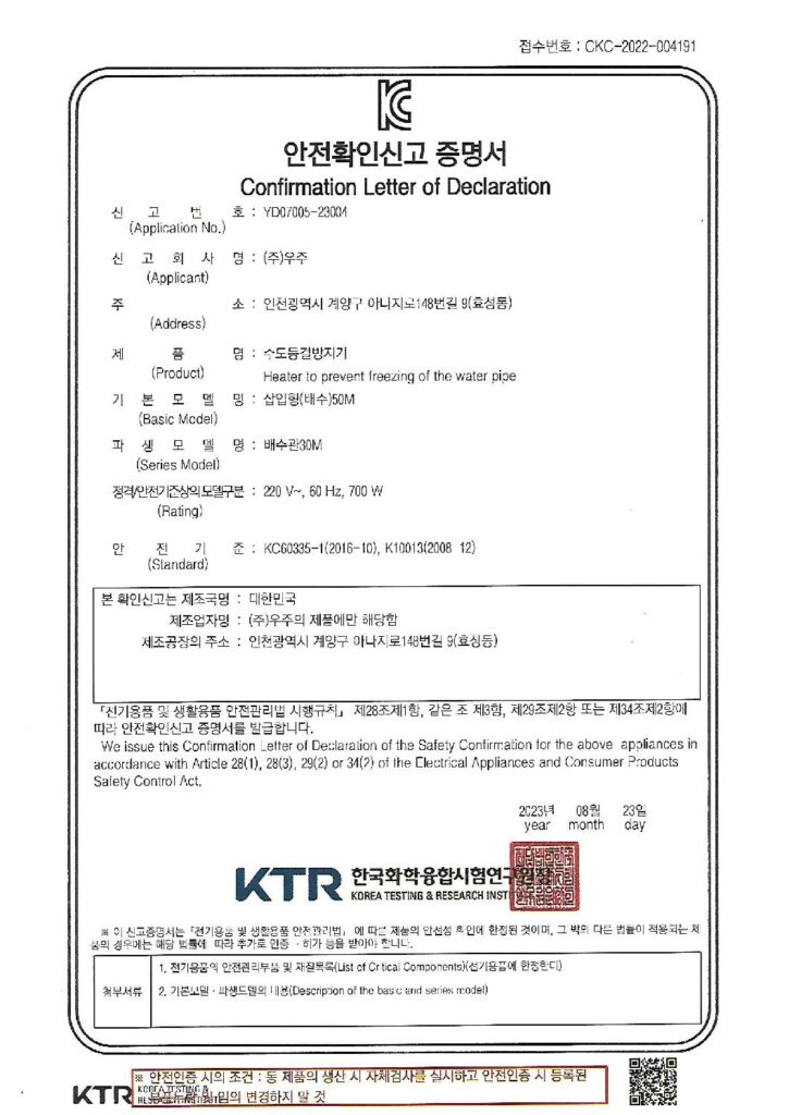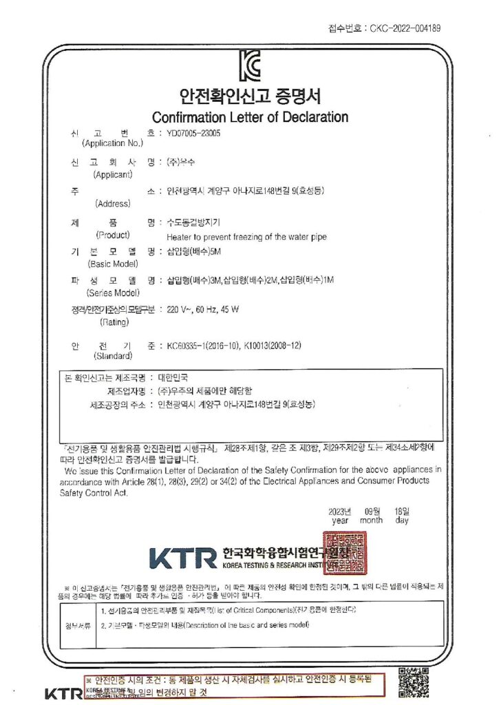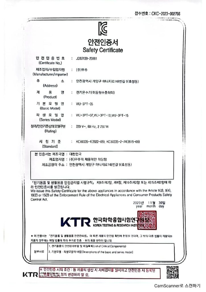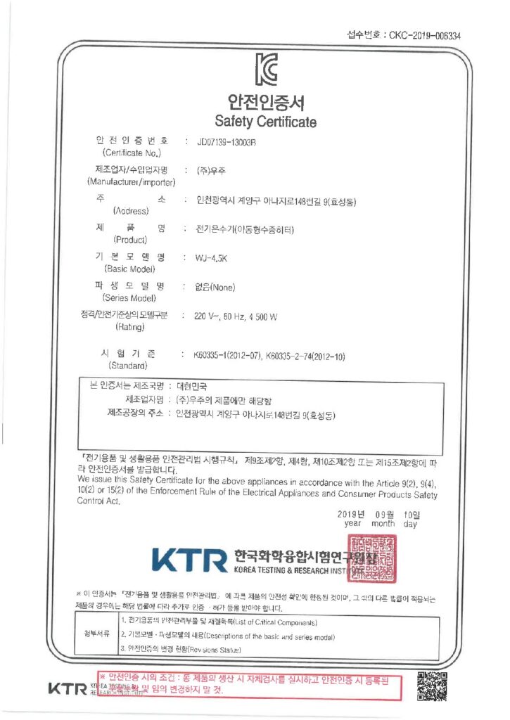 5K 온수히터 안전인증