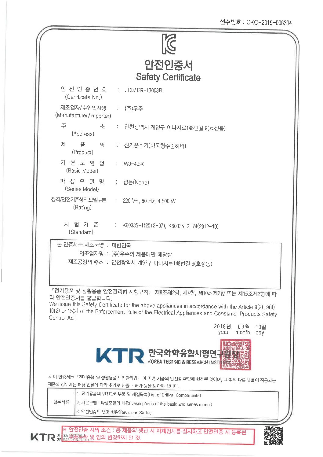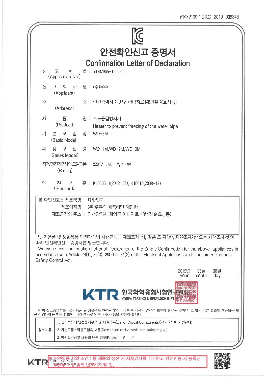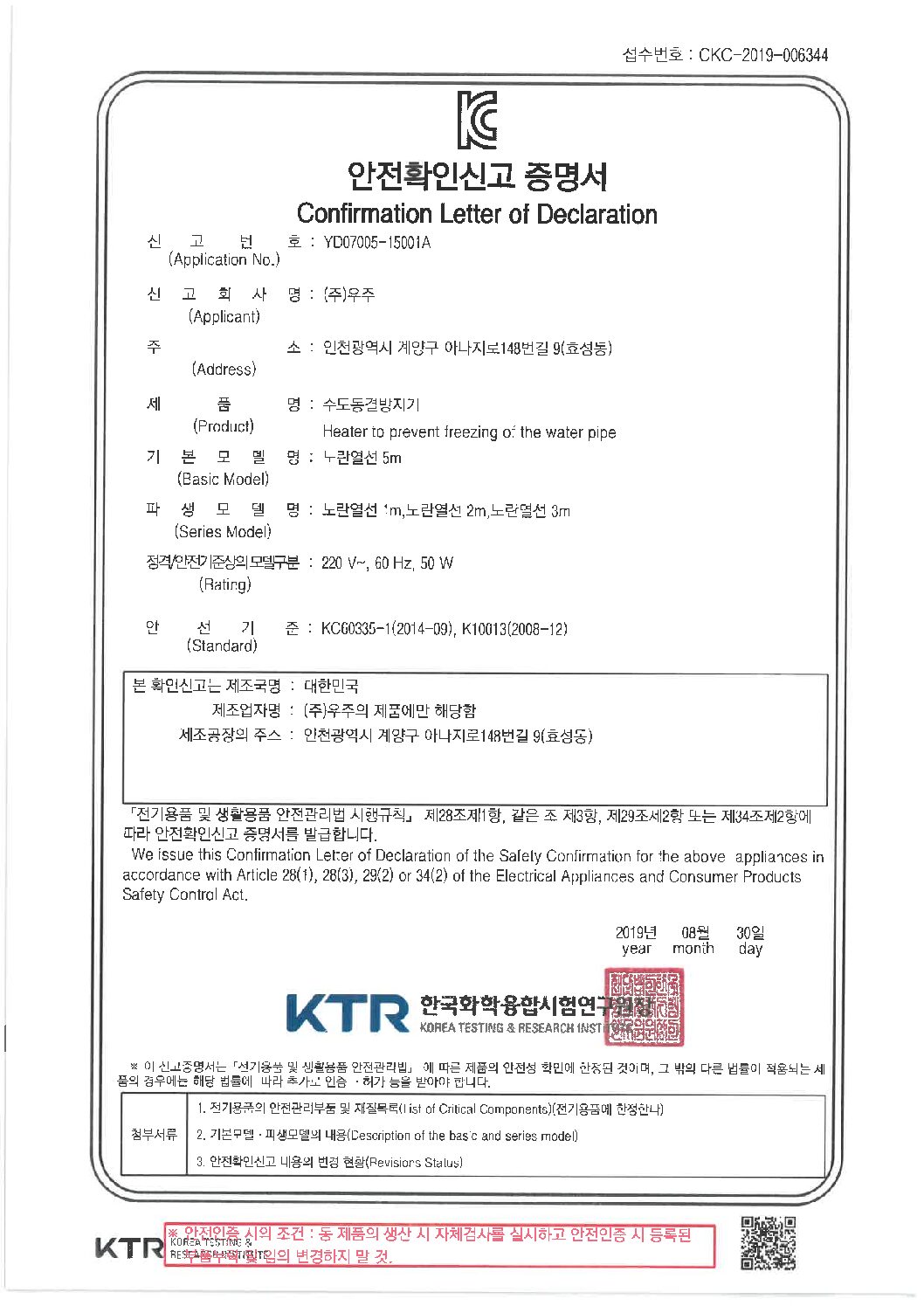 5K 온수히터 안전인증