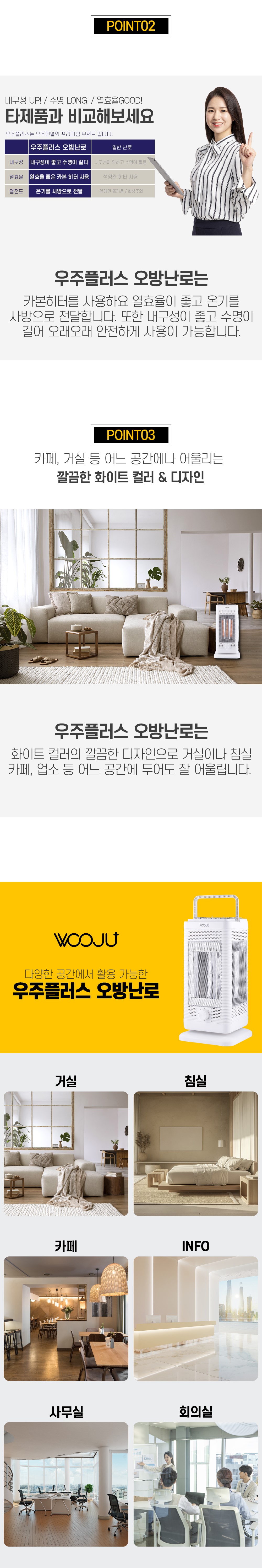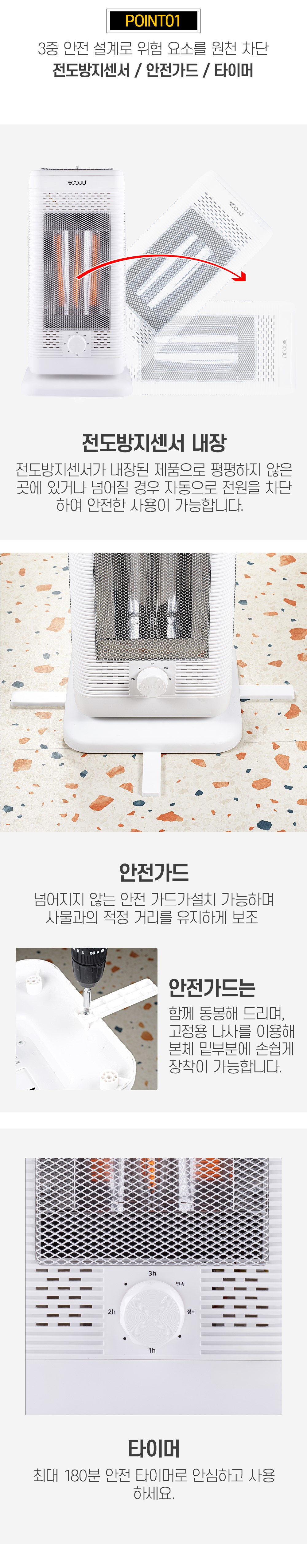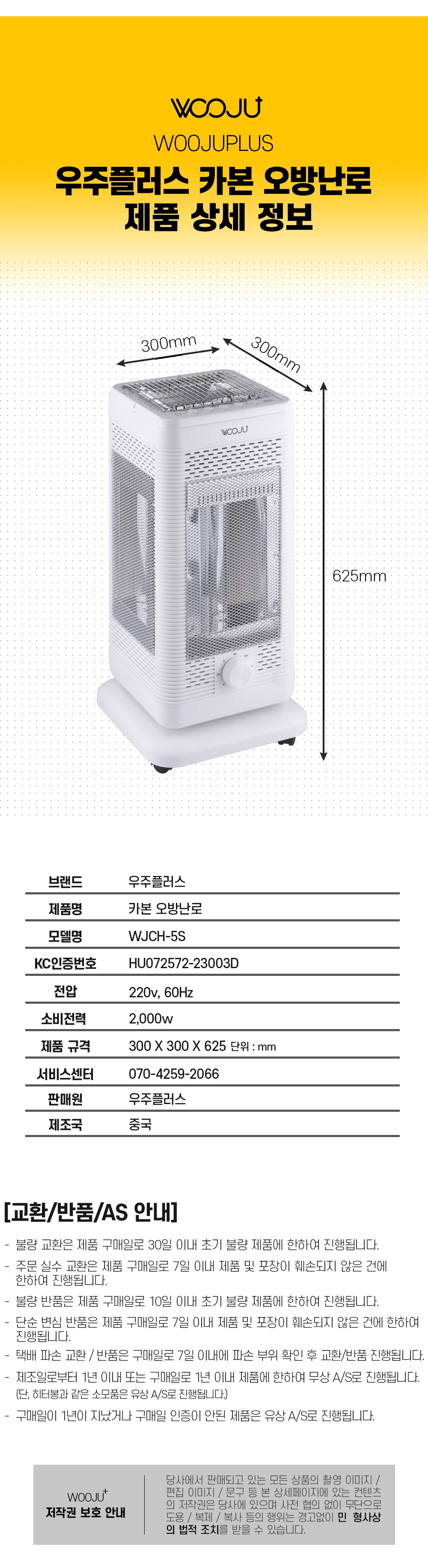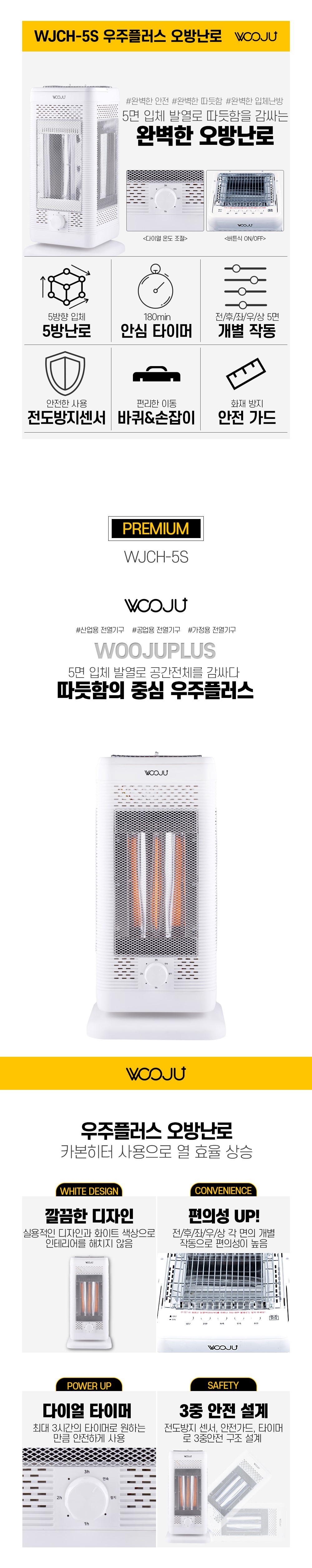 제품소개(신제품) 카본 오방난로WJCH-5S 용도 겨울철 난로 재질 프레임 : 금속, 플라스틱 발열체 : 카본 특징 2,000W 이동 손잡이 전/후/좌/우/상 각 면 개별 작동 바퀴 및 안전가드 동봉 타이머 (3시간) 전도방지센서 규격/종류 300*625*300 무게 : 4Kg