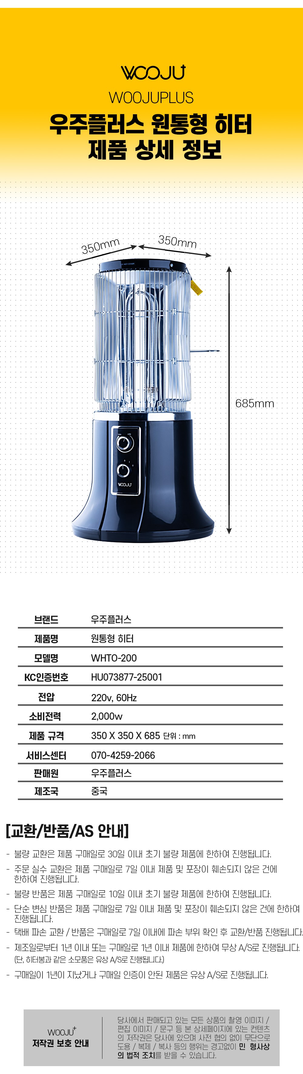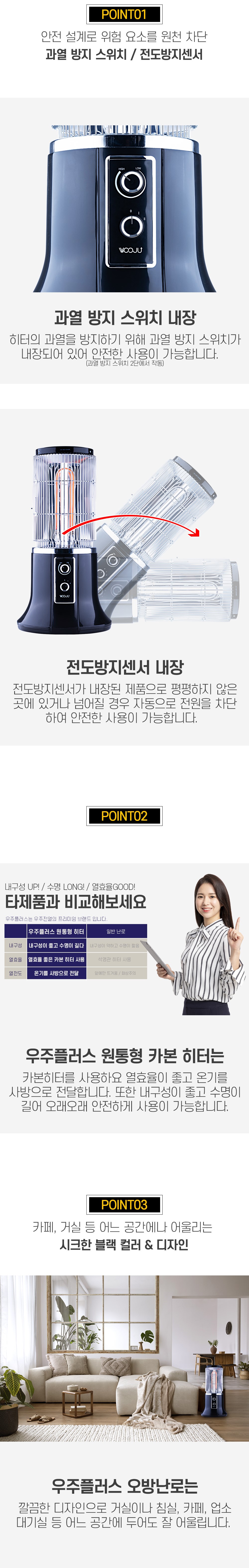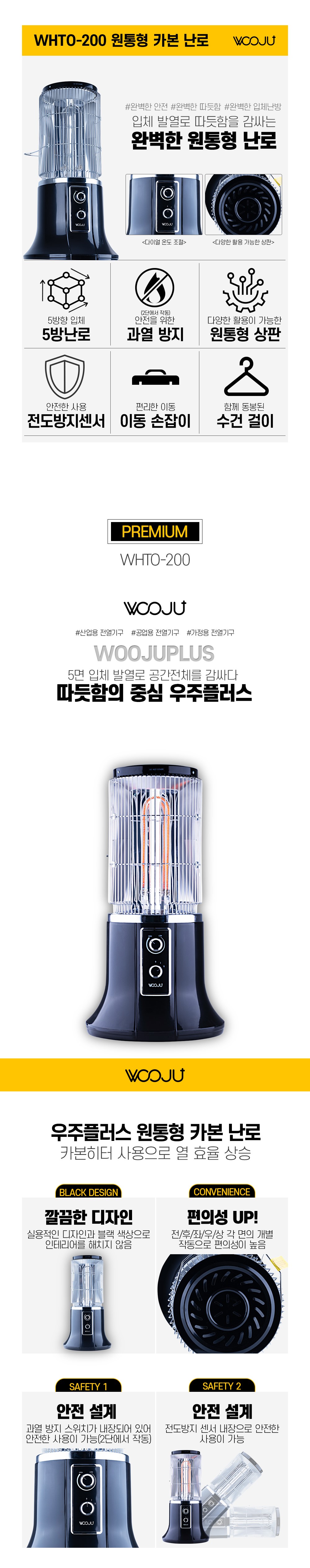 제품소개(신제품) 카본 원통형 난로WHTO-200 용도 겨울철 난로 재질 프레임 : 금속, 플라스틱 발열체 : 카본 특징 2,000W 수건걸이 및 손잡이 동봉 강약 조절 스위치 (1단/2단) 전도방지센서 과열방지 스위치 (* 2단에서만 사용 가능) 규격/종류 350*685*350 무게 : 4.5Kg