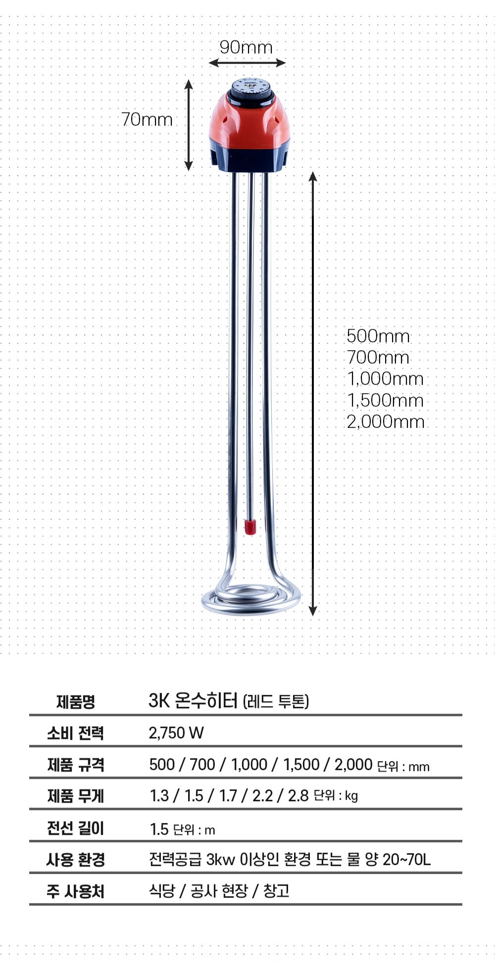 제품소개온수히터온수히터 3K 재질 스텐레스 재질 용도 산업현장이나 공장,사무실,상점 등 가스렌지가 없는곳이나 물통의 부피가 커 물을 데울수가 없을때 전기만 있으면 쉽고 편리하게 물을 데울수가 있음. 특징 – 물이 히터 하부로부터 15cm 이상 물이 있어야 전원 공급. – 깨끗한 물에 사용해야함(염분,화공약품,기름 등 사용 시 고장날수 있습니다.) – 전기안전인증번호 : JD07139-17001 규격/길이 3kw – 500㎜,700㎜,1000㎜,1500㎜,2000㎜ [video src="http://woojuheater.co.kr/wp-content/uploads/2024/01/12-ezgif.com-gif-to-mp4-converter.mp4" /]