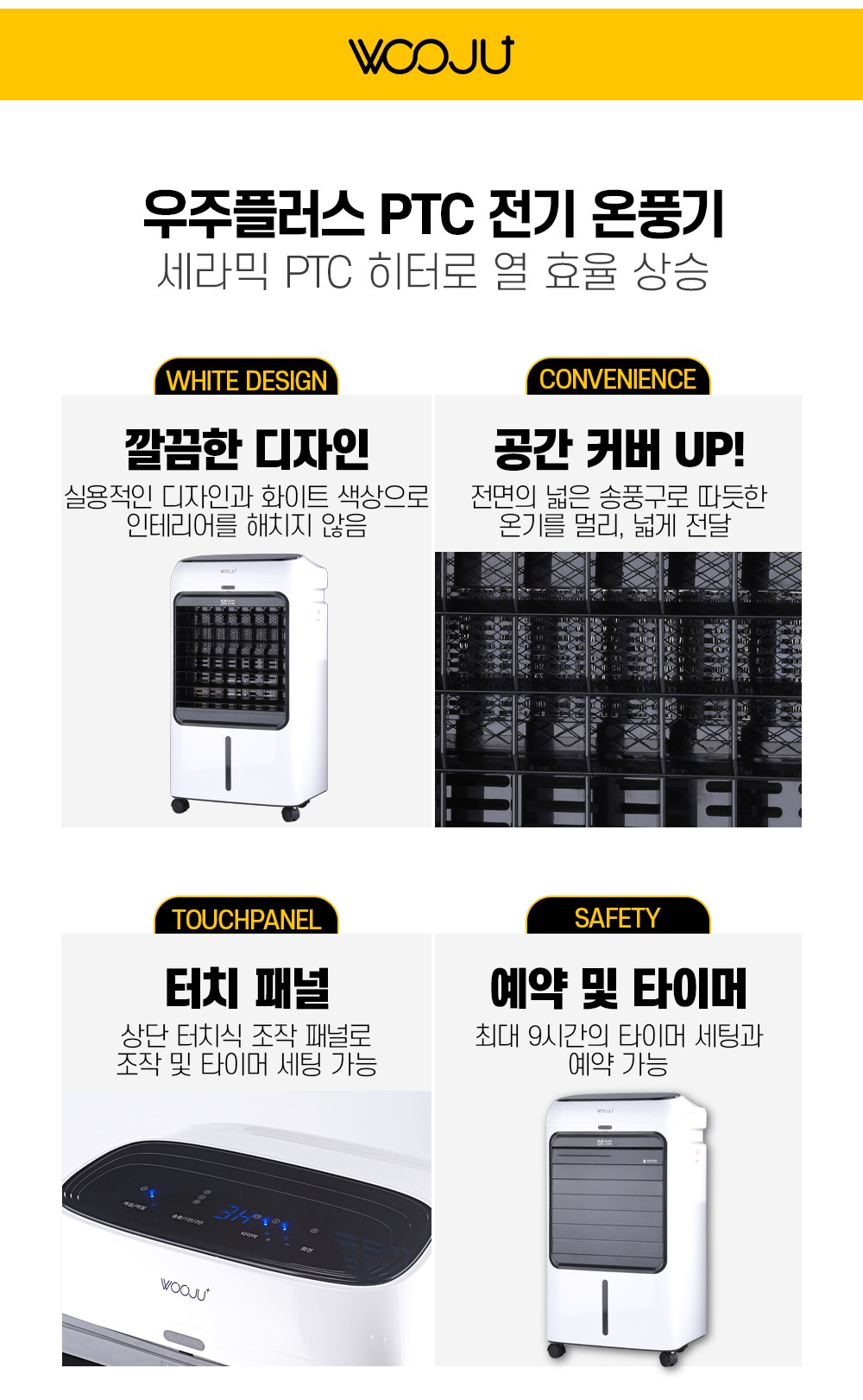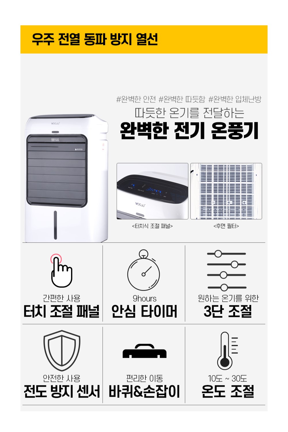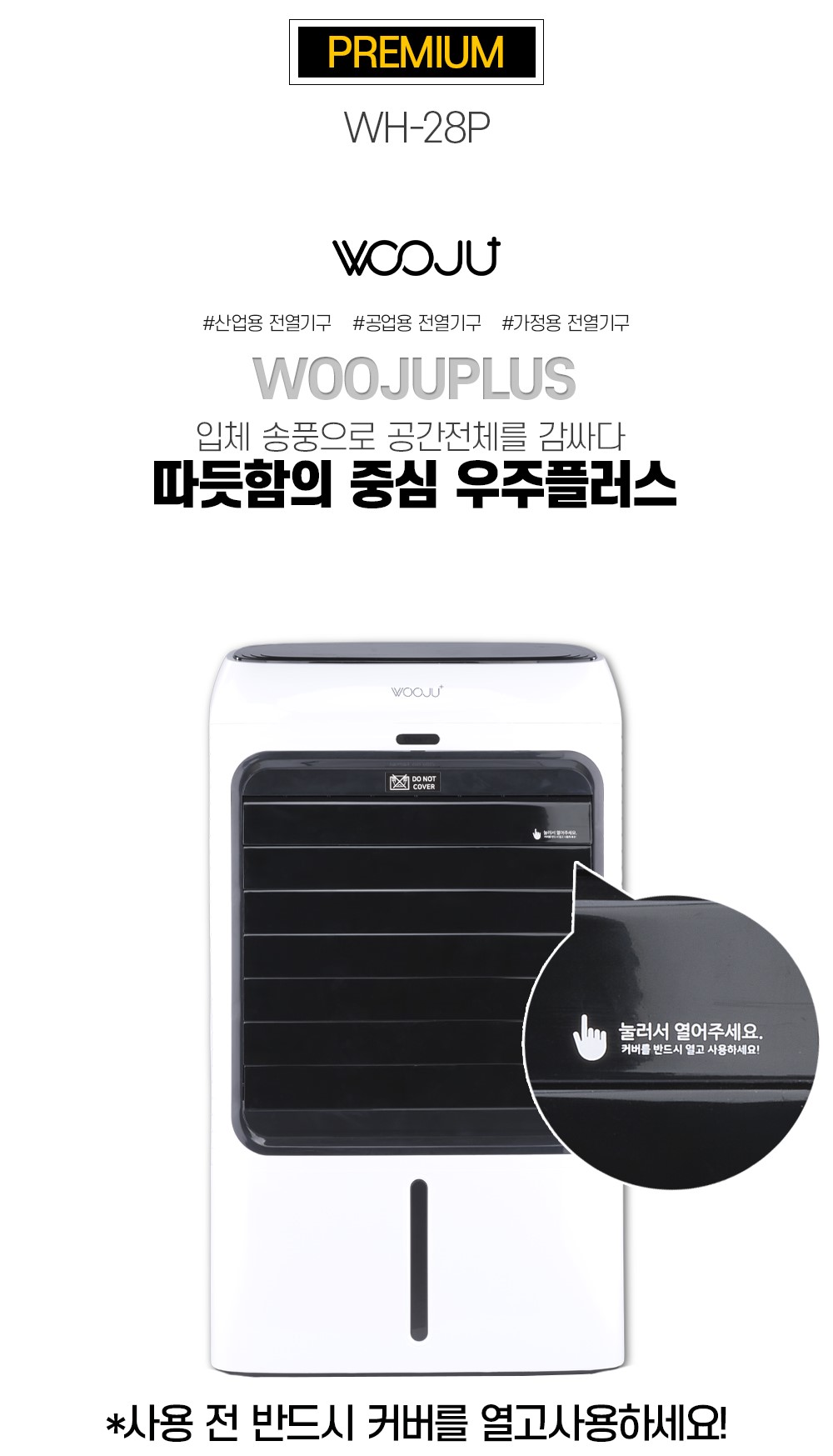 제품소개PTC 전기 온풍기WH-28P 용도 겨울철 난로 재질 플라스틱 발열체 : PTC 특징 2800W 터치식 조절 패널 3단 조절(송풍, 약, 강) 예약 및 타이머 : 9시간 온도조절 : 10도 ~ 30도 좌우회전 *반드시 개폐구를 열고 사용하세요. 규격/종류 2800W